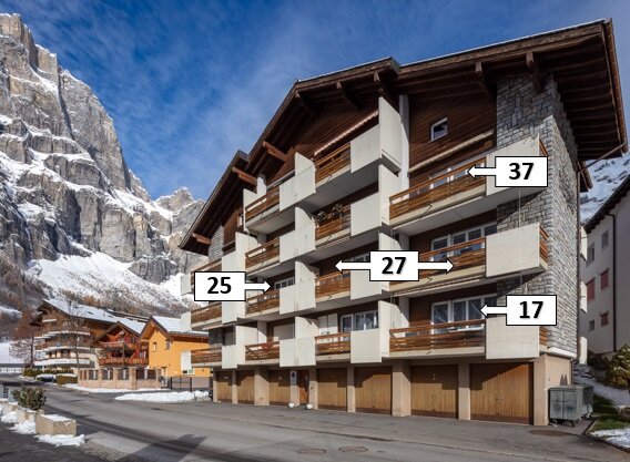Die grösste Wohnung (Nr. 27, 3½-Zimmer, ca. 80 m2) bietet Platz für bis zu 6 Personen. Sie verfügt über ein Doppelzimmer, ein geräumiges Wohnzimmer mit Ecksofa, Sessel, TV, WLAN, Esstisch, Balkon mit Sonnenstoren, Tisch und Wäscheständer, eine gut ausgestattete offene Küche mit Geschirrspüler, Mikrowelle, Kaffeemaschine, Toaster, Wasserkocher, Fondue-Caquelon, Raclette-Ofen und kleinem Balkon, ein Badezimmer mit WC/Dusche und Föhn sowie ein grosses Zimmer mit Doppelbett, Kajütenbett, TV, kleinem Tisch, eigenem Balkon mit Sonnenstoren und eigenem Badezimmer mit WC/Dusche.